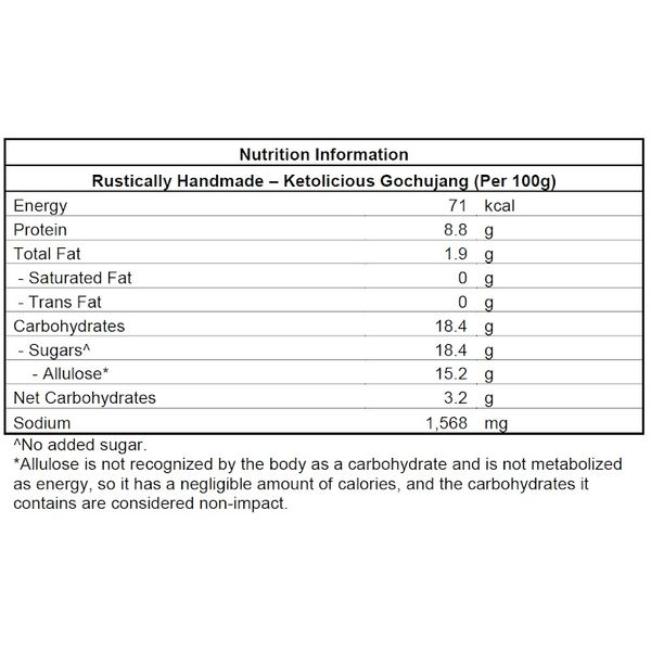 Ingredients: • Chilli powder • Allulose • Fish sauce • Soy sauce • Korean rice wine • Distilled water • Pre-roasted and fermented soybean powder • Psyllium husk